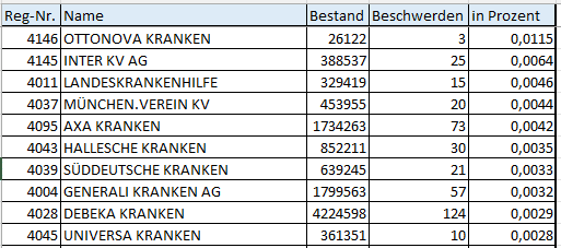 Die BaFin veröffentlicht ebenfalls regelmäßig eine Übersicht der Beschwerden, u.a. zu privaten Krankenversicherern. Aufgrund der sehr geringen absoluten Zahlen ist die “Beschwerdestatistik” sicherlich nur eingeschränkt aussagefähig.